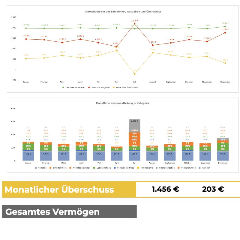 At the bottom of the document you will find the line "Monthly surplus". Here you can see at a glance whether you are in the black or in the red. A positive amount shows that you have spent less than you have earned - congratulations! A negative amount signals that you have spent more than you can afford. Now you can specifically look for potential savings and optimize your expenses.