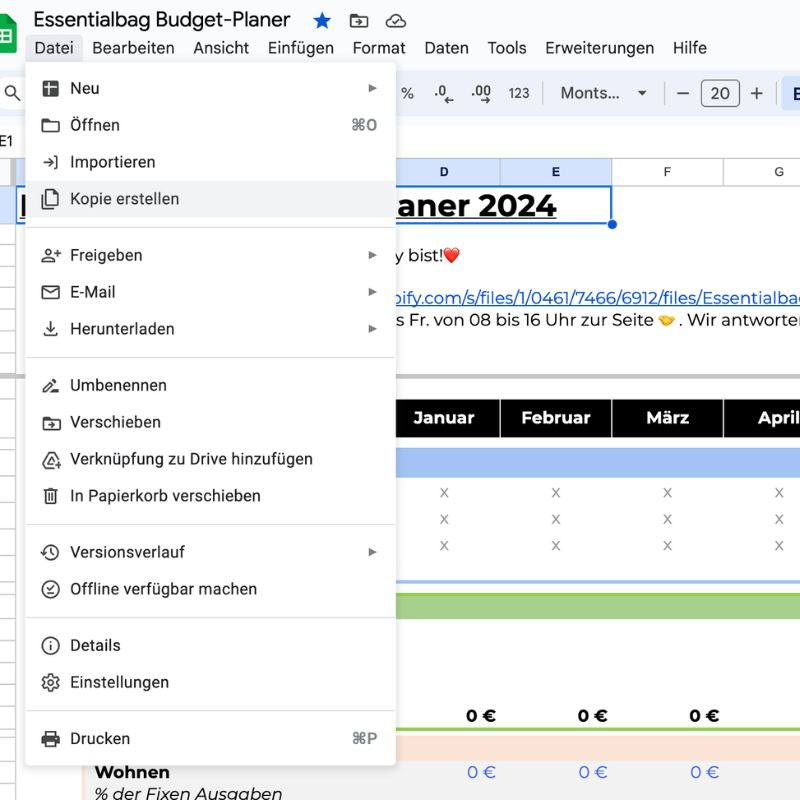 Open the link to the budget planner, which will take you directly to the Google Sheets file. Click on the "File" tab at the top and select "Make a copy" . You can then save the file locally or in your own Google Drive and name it whatever you like. This way, you always have your personal budget planner to hand.