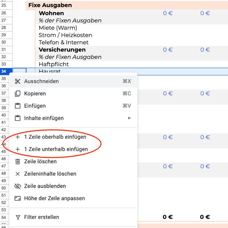 To add a row, right-click on the row number on the left margin. Select "Insert Row Above" or "Insert Row Below". This is how you can expand your budget planner.