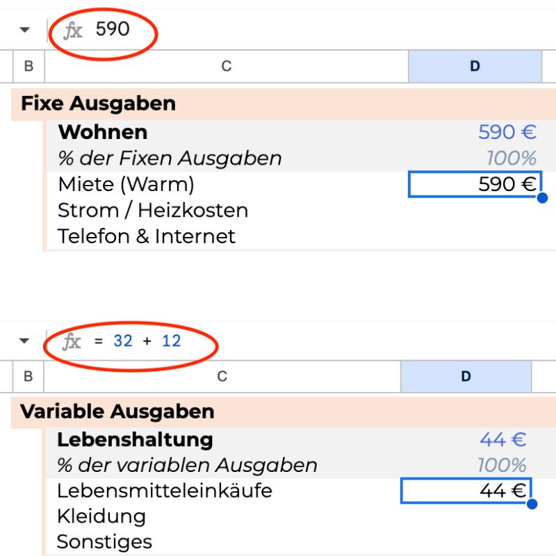 Select the relevant cell and enter your income or expenses in the formula line. For ongoing expenses, enter an "=" followed by the costs and extend them with a "+". This way you can accurately record all financial movements.