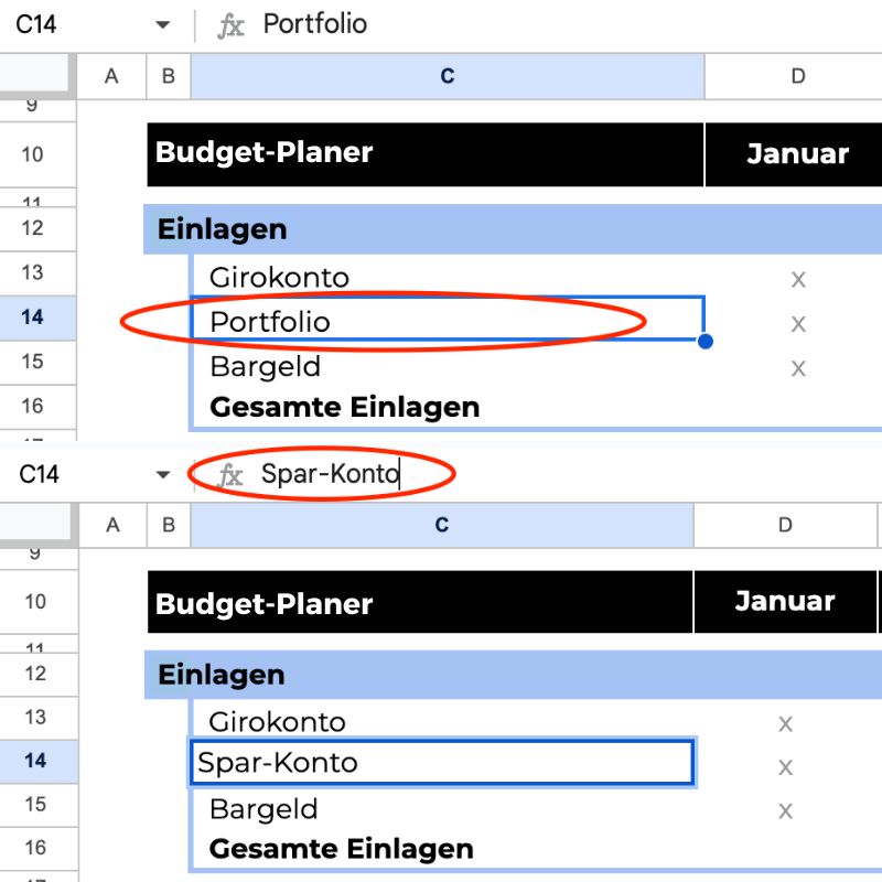 Click on the desired cell in the worksheet to edit it. In the formula row at the top you can enter your personal categories or entries and adjust the cells to suit your needs. This is a very easy way to personalize the budget planner.