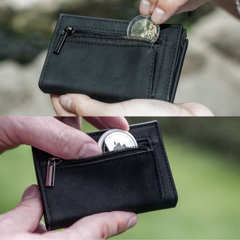 You can safely store an Apple AirTag in the coin compartment. Ideally, place it at the back to optimize rarely needed access.