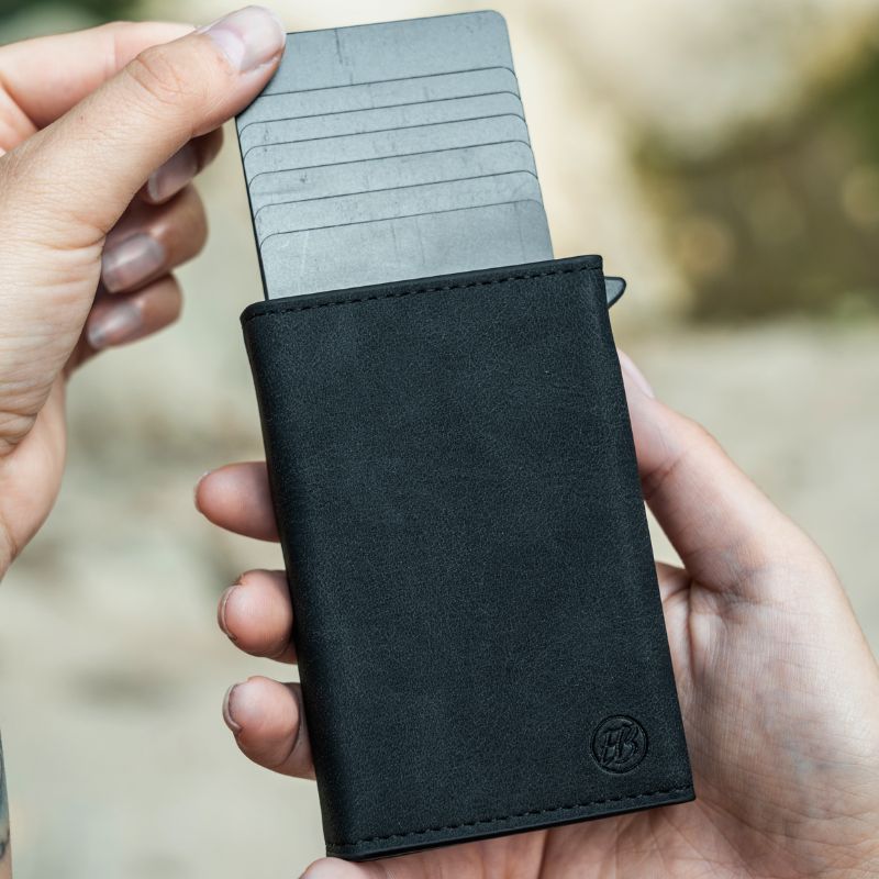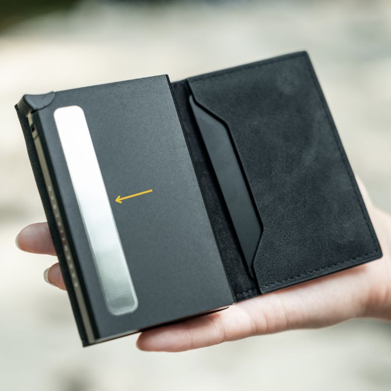 Store unimportant Cards that can be scanned without removing them inside the wallet (not in the aluminum compartment). Use either the right card compartment or the left cash compartment. An example of such a card would be a contactless access card or an RFID-based travel card. This ensures immediate use in everyday life.