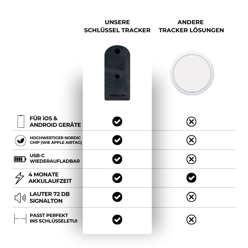 The Essentialbag Key Tracker helps you keep track of your keys at all times. Whether as a Bluetooth tracker or a GPS tracker for keys, this smart companion makes searching for them a thing of the past. Small, lightweight, and reliable, it's ideal for anyone who wants to make their everyday life easier and safer.